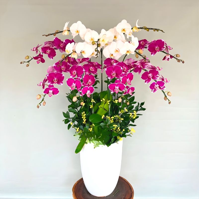 Chậu lan hồ điệp trắng tím được thiết kế cân đối với 11 cành cao khoảng 60–70cm, sắp xếp thành 2 tầng rõ ràng: tầng trên 5 cành trắng, tầng dưới 6 cành tím. Sự kết hợp này tạo nên tổng thể hài hòa, trong đó màu tím tượng trưng cho sự thủy chung, còn màu trắng thể hiện sự tinh khiết và trọn vẹn. Chậu lan hồ điệp tím trắng thường được trang trí thêm gỗ mộc, nơ đỏ và cây phụ xanh, phù hợp đặt tại phòng khách, sảnh công ty hoặc quầy lễ tân.