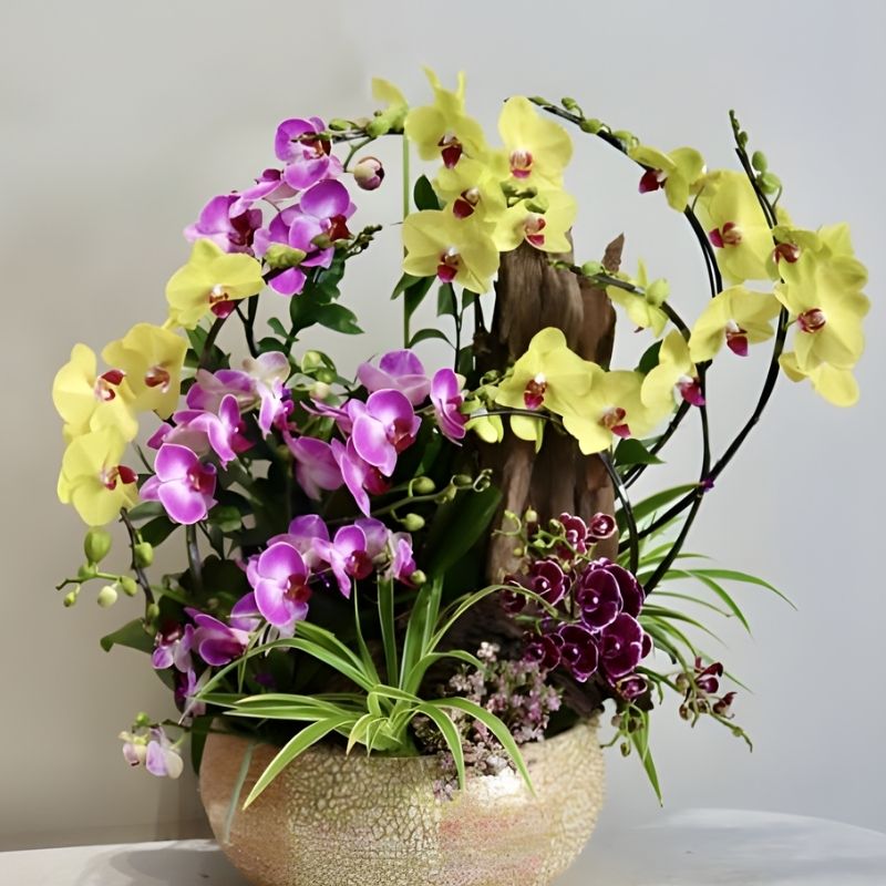 Lan hồ điệp mini 6 màu được phối hợp tinh tế giữa những sắc hoa tươi sáng, tạo nên tổng thể hài hòa và bắt mắt. Từng cánh hoa nhỏ nhắn, mềm mại nhưng lại toát lên sự mạnh mẽ, kiêu hãnh – đặc trưng riêng của dòng hoa lan này. Chính sự hòa quyện giữa nhiều màu sắc trong cùng một chậu lan đã tạo nên cảm giác tươi mới, vui vẻ đồng thời truyền tải thông điệp về sự đủ đầy, may mắn và khởi đầu thuận lợi.