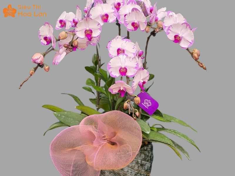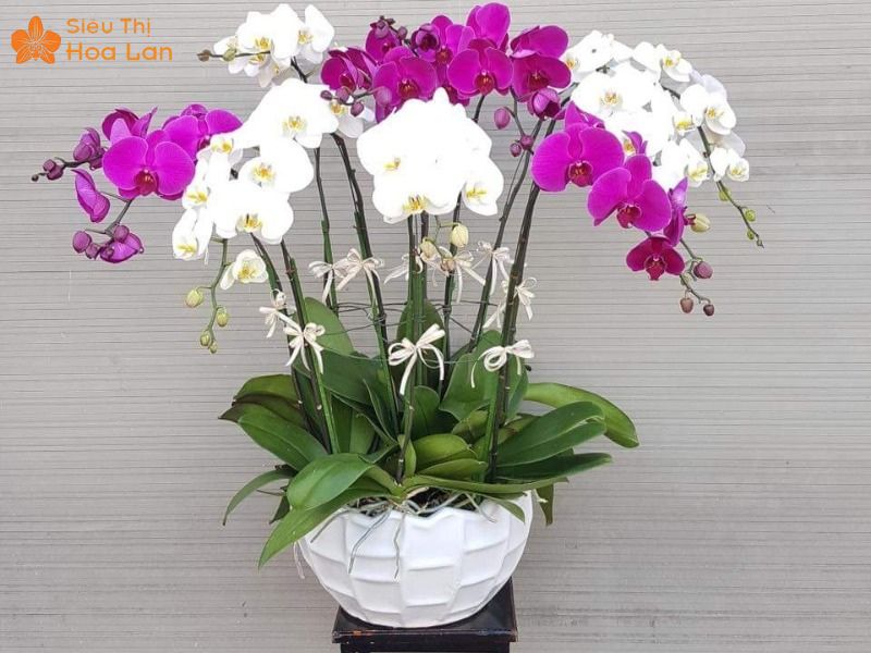 Lan hồ điệp tím 50 cành là lựa chọn hoàn hảo để trang trí không gian hoặc làm món quà sang trọng. Mỗi cành lan nở rộ, tỏa hương nhẹ nhàng, kết hợp sắc tím lãng mạn cùng trắng tinh khôi, tạo nên vẻ đẹp hài hòa. Chậu sứ cao cấp giữ cho các cành lan luôn vững vàng, đồng thời mang đến thuận lợi, tài lộc và thịnh vượng cho gia chủ. Đây là món quà ý nghĩa, gửi gắm lời chúc an khang, sung túc nhiều dịp quan trọng.